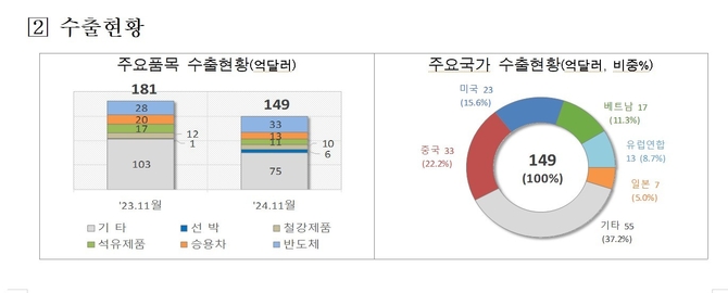 수출 주요 국가로는 대만(29.2%), 홍콩(3.9%) 등이 증가했으나 중국(-14.6%), 미국(-37.5%), 베트남(-6.0%) 등은 감소했다.