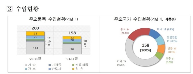수입 주요품목은 전년동기대비 반도체 제조장비는 27.9%로 증가했으며 원유(-35.0%), 반도체(-1.0%), 가스(-15.0%) 등은 감소했다.