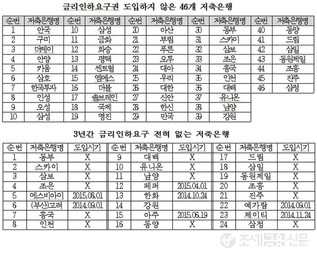 더욱이 2013년~2015년 8월 현재까지 금리인하요구 자체가 없었던 저축은행도 24개(약30.4%) 되었다.