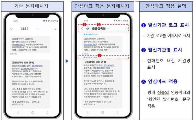 앞으로 금융감독원이 발송하는 문자메시지에는 인증마크와 안심문구(확인된 발신번호), 금감원 로고 등이 함께 표시돼 소비자가 문자메시지의 출처를 명확하게 확인할 수 있게 된다.