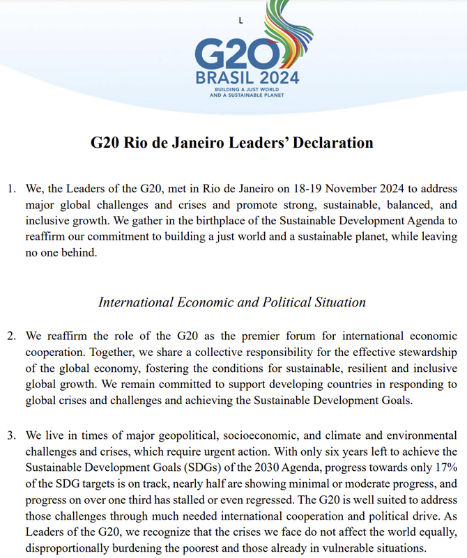 이건 의례의 영역이고, 이 기사 아래로 스크롤을 내리면 올해 브라질 G20 회의의 핵심 주제가 나온다.