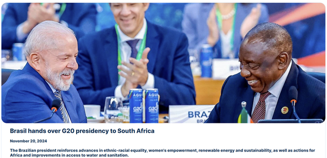 G20 첫 번째 보도는 ‘이번 회의 의장국인 브라질이 다음 의장국인 남아프리카 공화국과 악수를 나누었다’다.