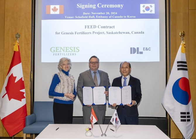 21일 DL이앤씨에 따르면 회사는 지난 20일 주한 캐나다 대사관에서 캐나다 비료 업체 제네시스 퍼틸라이저스(Genesis Fertilizers)와 비료 공장 프로젝트의 설계·기술 라이선싱 업무 수행 계약을 체결했다.