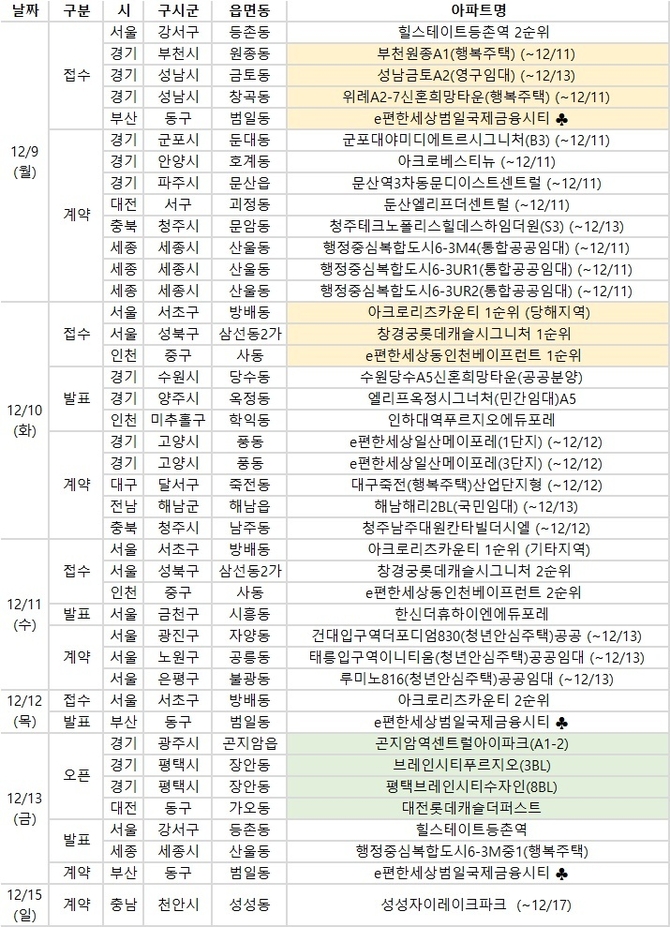 주요 청약 단지는 서울 서초구 방배동 '아크로리츠카운티', 서울 성북구 삼선동2가 '창경궁롯데캐슬시그니처', 인천 중구 사동 'e편한세상동인천베이프런트' 등이다.
