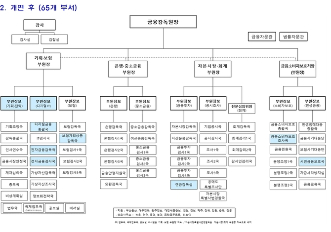 보험상품 감독업무는 기존 보험리스크관리국을 개편한 보험계리상품감독국으로 일원화한다. 은행‧보험 등 주요 감독 업무를 수행해온 노영후 비서실장이 보험감독국장으로 자리를 옮긴다. 보험상품과 IFRS17을 담당한 보험계리감독국에는 보험 전문가이자 회계사인 이권홍 보험감독국 팀장이 온다. 보험검사2국에는 법무 제재 업무에서 높은 성과를 보인 변호사 출신 서창대 국장, 보험검사3국에는 회계사로 검사 업무 전문성이 높은 김재갑 국장이 부서장으로 온다.