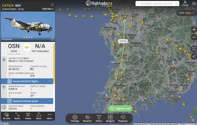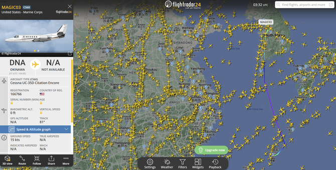 (조세금융신문=고승주 기자) 13일 12시 30분께 태평양 지역 최대 공군기지인 가데나 공군기지에서 출발한 세스나 UC-35D 사이테이션 엔코어 수송기가 한국 오산공군기지에 도착한 후 얼마 안 돼 다시 오키나와 가데나 공군기지로 이동, 14시 6분 현재 제주 앞바다 쪽으로 이동 중이다. 콜사인은 MAGIC-03, 출처는 항공기 추적 사이트 ‘Flightradar24’다.