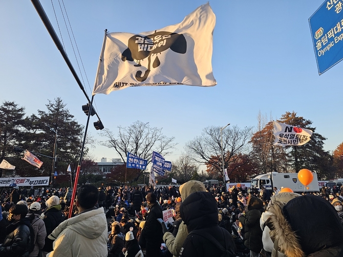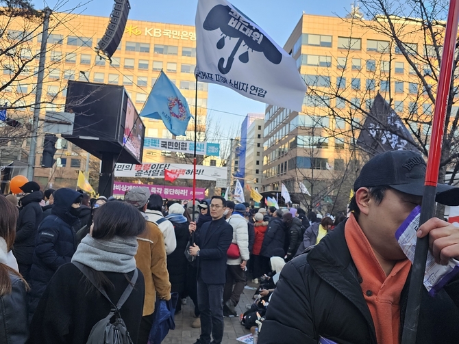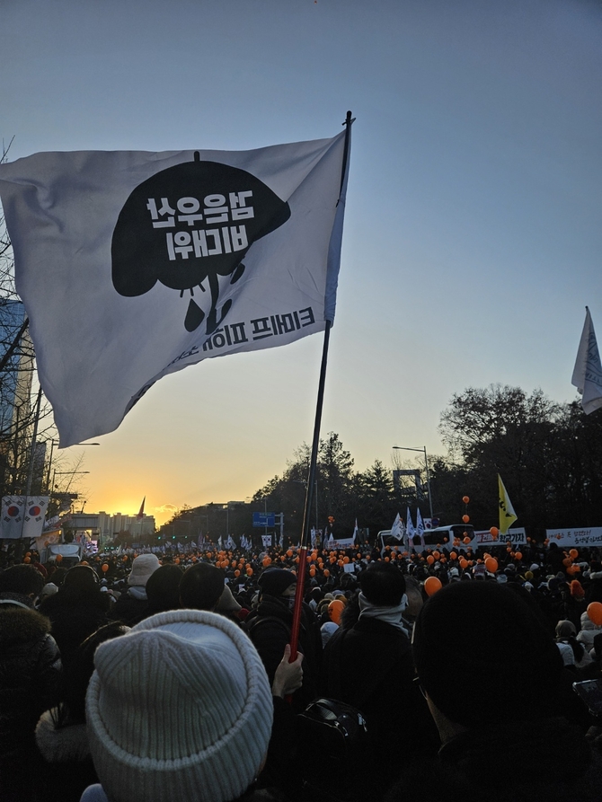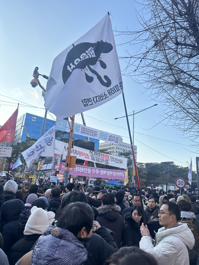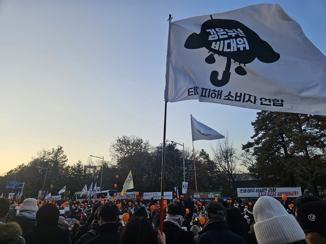 신정권 검은우산 비대위원장은 이날 시민들과 함께 윤석열 대통령 탄핵 시위에 앞장서며 "검은 우산 비대위는 티메프 사태로 받은 피해보다 더 큰 피해인 국민 주권의 억압과 민주주의 이념을 찬탈하려 한 윤석열 탄핵을 요구한다"고 강조했다.