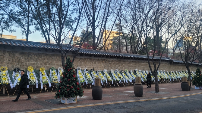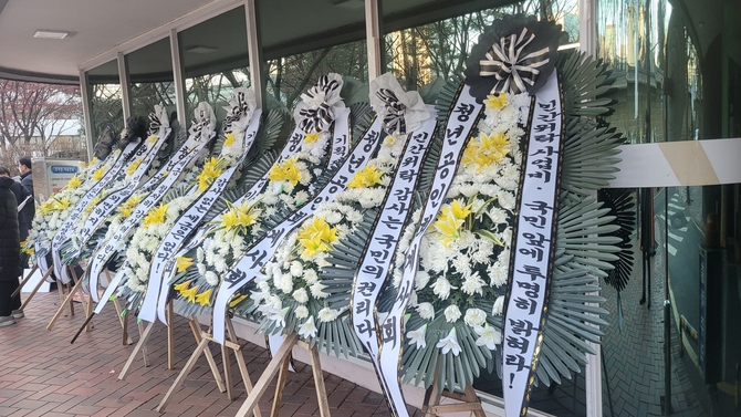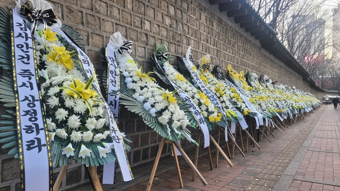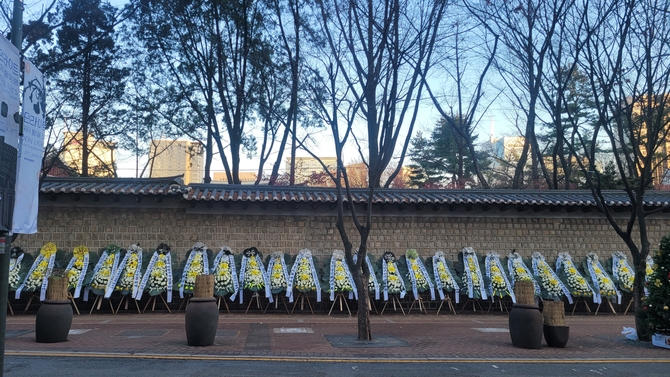청년공인회계사회는 16일 서울시의회와 인근 돌담길에 민간위탁 감사를 촉구하는 내용의 근조화환 시위를 진행했다.