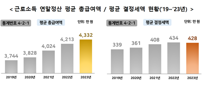 (조세금융신문=고승주 기자) 2023년 귀속 근로소득 연말정산을 신고한 근로자의 평균 총급여액은 4332만원, 평균 결정세액은 428만원으로 나타났다.