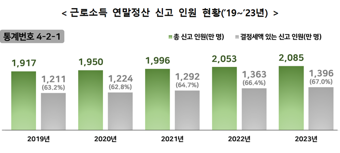 지난해 근로소득 연말정산 신고 인원은 2085만명으로 전년(2053만명) 대비 32만명(1.5%) 늘었다. 이중 결정세액 있는 신고 인원은 1396만명으로 전체 신고 인원의 67.0%에 달했다.