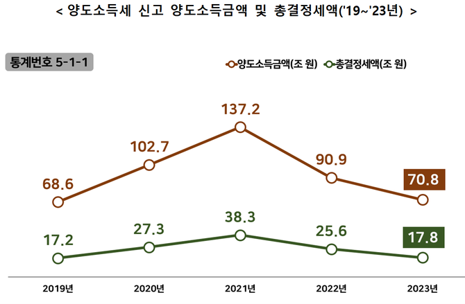 양도소득금액은 70.8조원으로 최근 양도소득신고가 가장 컸던 2021년(137.2조원)의 반절 수준으로 줄었다. 이는 2019년 양도소득신고금액 68.6조원과 비슷한 수준이다.