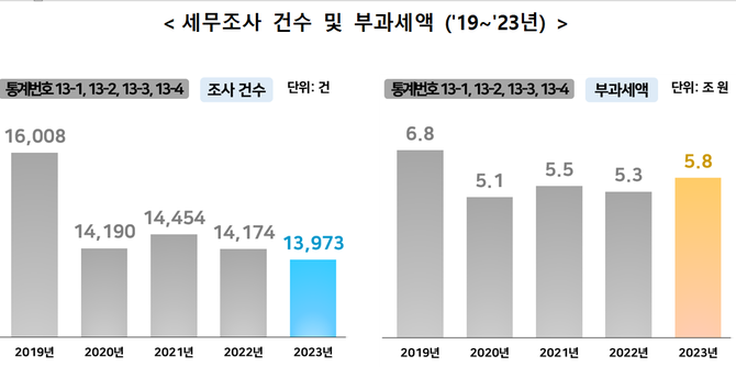 전년 대비 세무조사 건수는 1.4%(201건) 줄었지만, 부과세액은 9.4%(0.5조원) 증가했다.