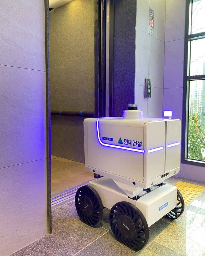 14일 현대건설에 따르면 회사는 현대자동차그룹 스타트업 ‘모빈(Mobinn)’과 공동 개발한 실내외 통합 자율주행 로봇배송 서비스를 오는 6월 준공 예정인 ‘디에이치 대치 에델루이’에 첫 적용한다.