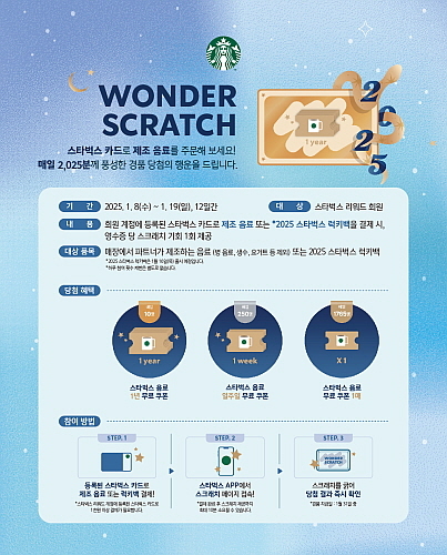 (조세금융신문=민경종 전문기자) 스타벅스 코리아(대표 손정현)가 오는 19일까지 2만 4천여 명의 고객에게 행운을 선물하는 ‘뉴이어 원더 스크래치’ 이벤트를 마련하고 그 자리로 초대했다.