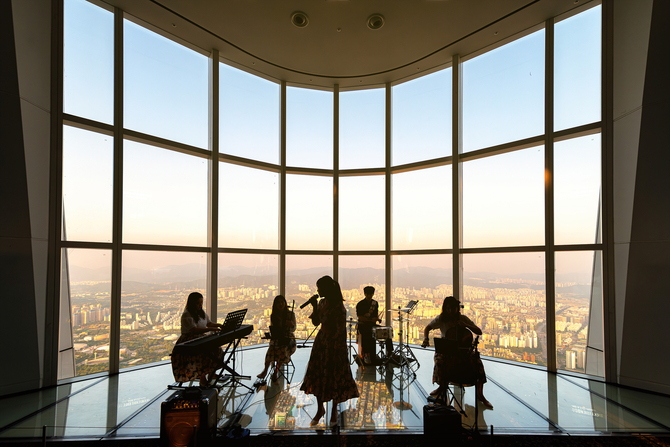 롯데월드타워 전망대 서울스카이에서는 퓨전 국악 버스킹이 펼쳐지며 즐거움을 더한다.
