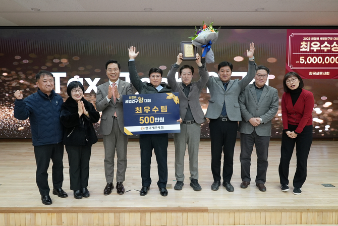 (조세금융신문=이지한 기자) 제1회 한국세무사회장배 세법연구왕 대회에서 대구지방세무사회 ‘택스테크 연구회’ 팀이 영예의 최우수상을 차지했다.