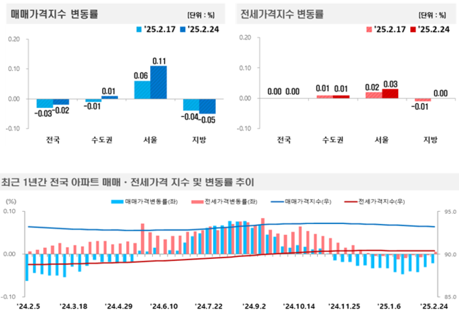 한국부동산원이 발표한 2025년 2월 4주(2월 24일 기준) 주간 아파트 가격 동향에 따르면, 전국 아파트 매매가격이 –0.02%를 기록하며, 지난주(-0.03%) 대비 하락세가 둔화됐다. 하지만 시장 내부를 들여다보면 수도권과 지방 간의 양극화가 더욱 심화되는 흐름이 뚜렷하다.