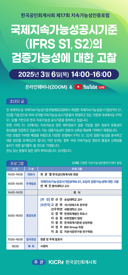 (조세금융신문=고승주 기자) 한국공인회계사회(회장 최운열)가 6일 ‘제17회 지속가능성인증포럼’을 개최하고 국제지속가능성공시기준(IFRS S1, S2)의 검증가능성을 논의한다.