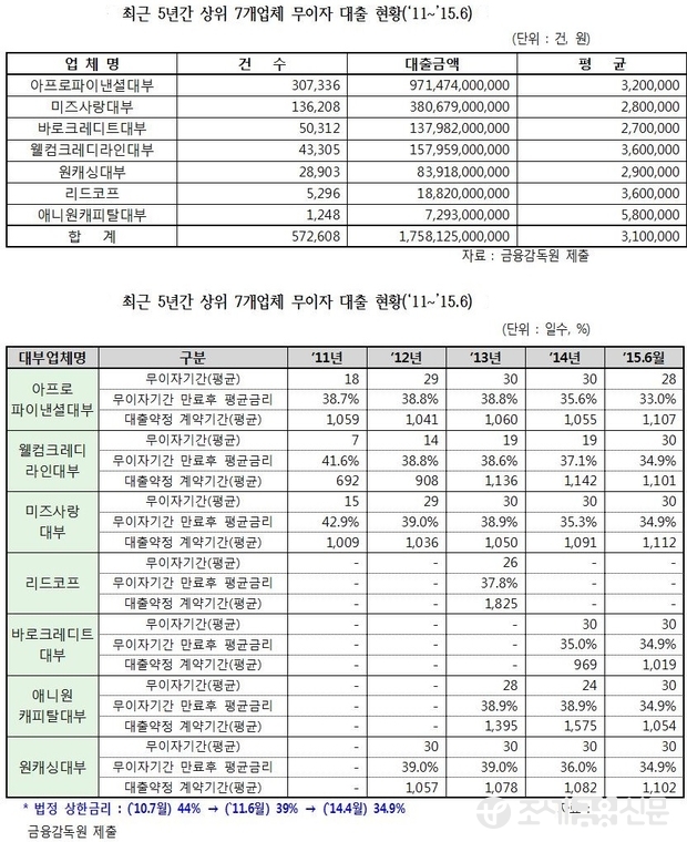 이 자료에 따르면 같은 기간 동안 이자면제 이벤트를 통해 아프로파이낸셜대부가 9,715억원(30만 7,336건)의 대출실적을 올렸으며, 미즈사랑대부가 3,807억원(13만 6,208건), 웰컴크레디라인대부가 1,580억원(4만 3,305건), 바로크레디트대부가 1,380억원(5만 312건)으로 뒤를 이었다.