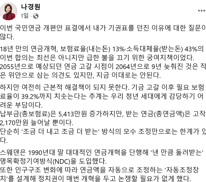 나 의원은 이날 자신의 SNS를 통해 “18년 만의 연금개혁이지만, 보험료율(내는 돈) 13%, 소득대체율(받는 돈) 43%로 합의된 이번 방안은 최선은 아니었고, 연금 고갈 시점을 2055년에서 2064년으로 9년 늦췄다는 것도 작은 위안일 뿐”이라며 이같이 말했다.