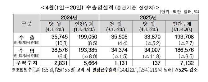 관세청이 21일 발표한 ‘4월 1~20일 수출입 현황(잠정치)’에 따르면, 수출은 339억 달러로 전년 동기 대비 5.2% 감소했고, 수입은 340억 달러로 11.8% 줄었다. 이로써 무역수지는 1억 달러 적자를 기록했다.