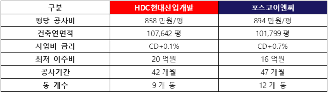공사기간에서도 HDC현산은 경쟁 우위를 확보했다. HDC현산은 공사기간을 42개월로 제시, 포스코이앤씨(47개월)보다 5개월 짧다. 공기가 짧아질수록 금융비용 부담은 줄고, 입주 지연에 따른 조합원 부담 역시 감소한다.