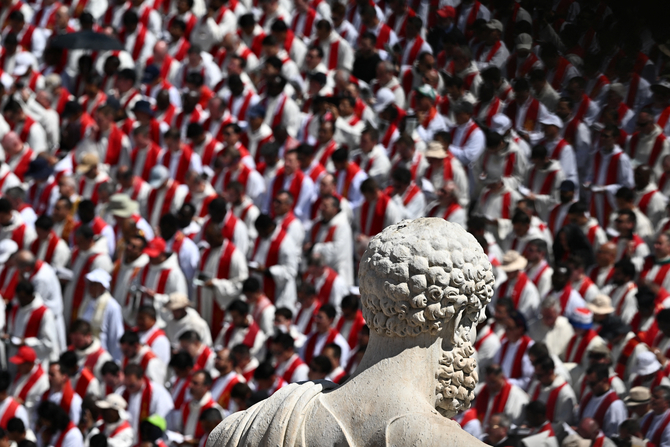 지난 23일부터 사흘간 진행된 일반 조문에는 약 25만명이 성 베드로 성전을 찾아 조의를 표했다. 프란치스코 교황의 시신은 허리 높이 관대를 쓴 전임자들과 달리 바닥과 가까운 낮은 곳의 목관에서 조문객을 맞았다.