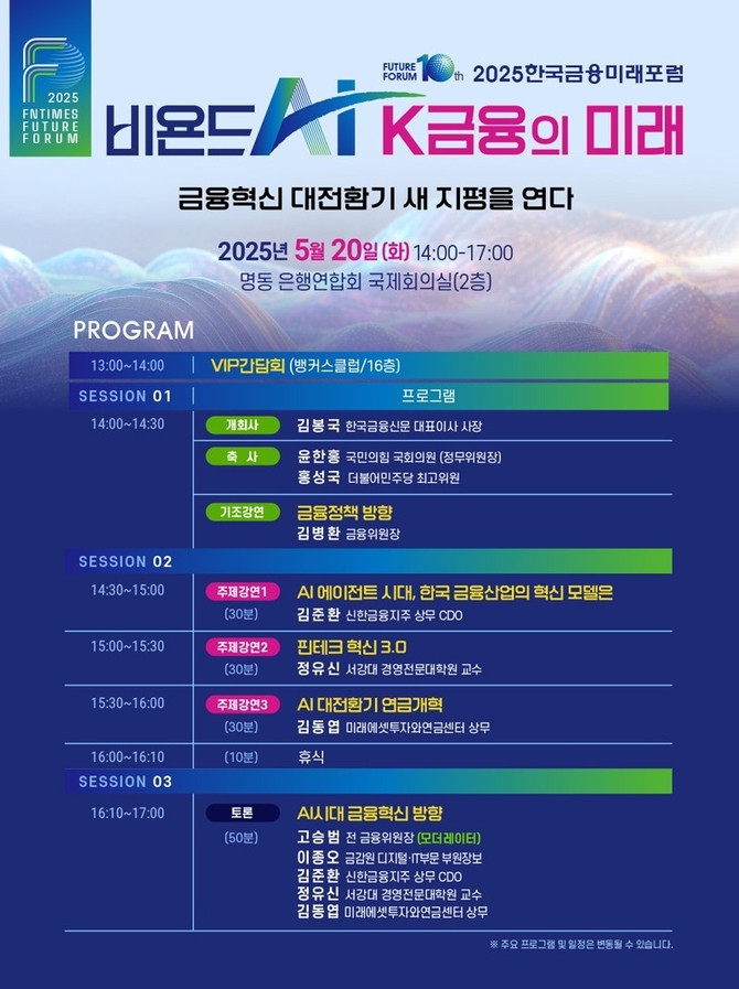 한국금융신문 창간 33주년을 기념한 이번 포럼은 ‘비욘드 AI, K금융의 미래’를 주제로 금융혁신 대전환기 새 지평을 여는 전략을 모색한다.