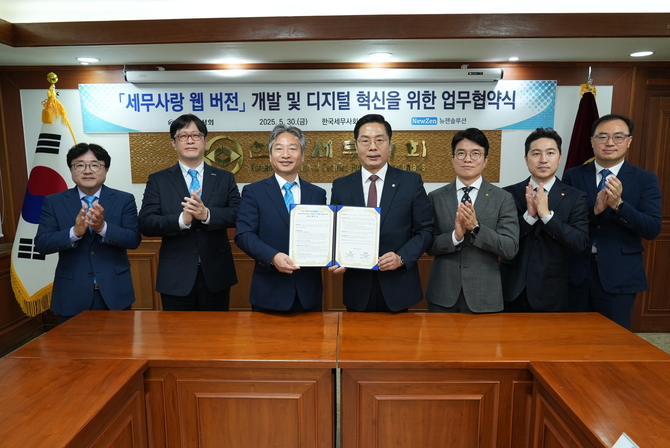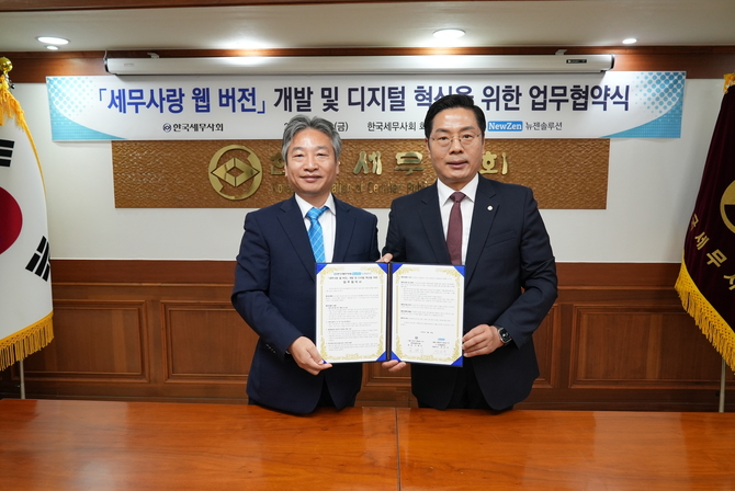 세무사회는 30일 서울 서초동 한국세무사회관에서, 2013년 세무사회에 ‘세무사랑2’ 프로그램을 무상 제공하고 현재까지 지속적으로 유지보수를 맡아온 ㈜뉴젠솔루션과 ‘세무사랑 웹 버전 개발 및 디지털 혁신을 위한 업무협약(MOU)’을 체결했다. 이번 협약을 통해 세무사회는 클라우드 및 AI 기반의 차세대 세무회계시스템 개발에 본격적으로 착수할 예정이다.
