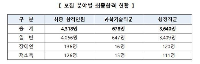 행정직군은 3천640명, 과학기술직군은 678명이 합격했다. 장애인은 136명, 저소득층은 126명이 최종 합격 통보를 받았다.