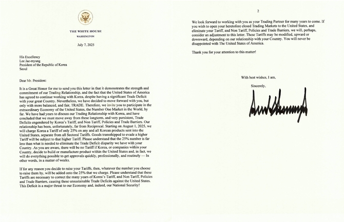 이 서한은 이재명 대통령을 수신자로 지정했다. 관세율 25%는 트럼프 대통령이 지난 4월 2일 한국에 부과하겠다고 발표한 상호관세 25%와 같다.