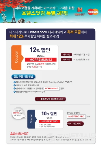프로모션에 참여하기 위해서는 연말까지 마스터카드 회원 전용 URL(http://bit.ly/1EBkRzT)로 호텔스닷컴에 접속해 원하는 호텔 상품을 선택하고, 결제창에 할인코드(MCPREMIUM12)를 입력한 뒤 마스터카드로 결제하면 된다.