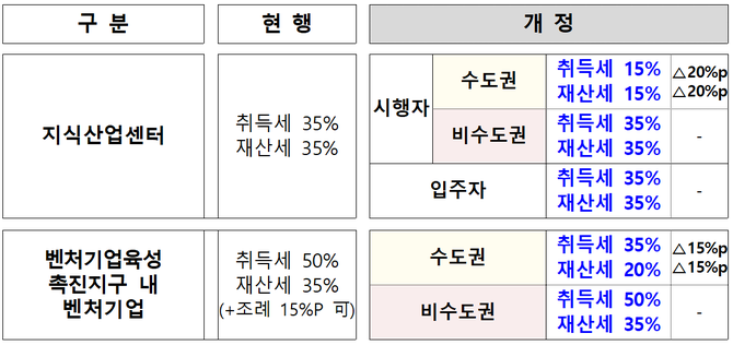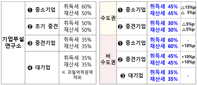 지식산업센터‧벤처기업‧연구소 등도 마찬가지로 수도권‧비수도권‧인구감소지역으로 세분화해 현재 수도권 비수도권 기업에 주는 취득세‧재산세 혜택을 빼서 인구감소지역에 덧붙인다.
