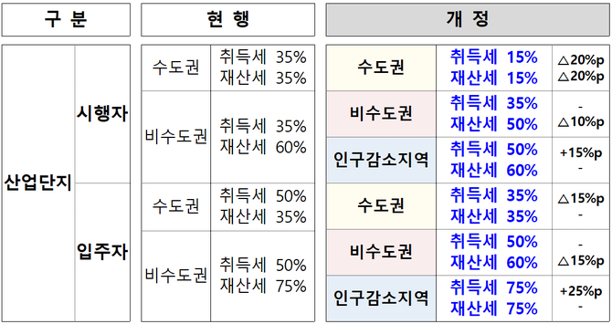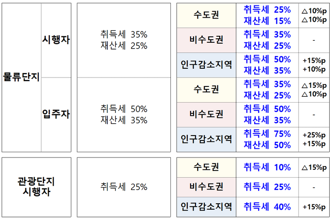 예를 들어 인구감소지역 산업단지의 경우 시행자‧입주자 취득세가 두 자릿수로 늘었으며, 물류단지의 경우 재산세 감면율이 10~15%p 증가했다.