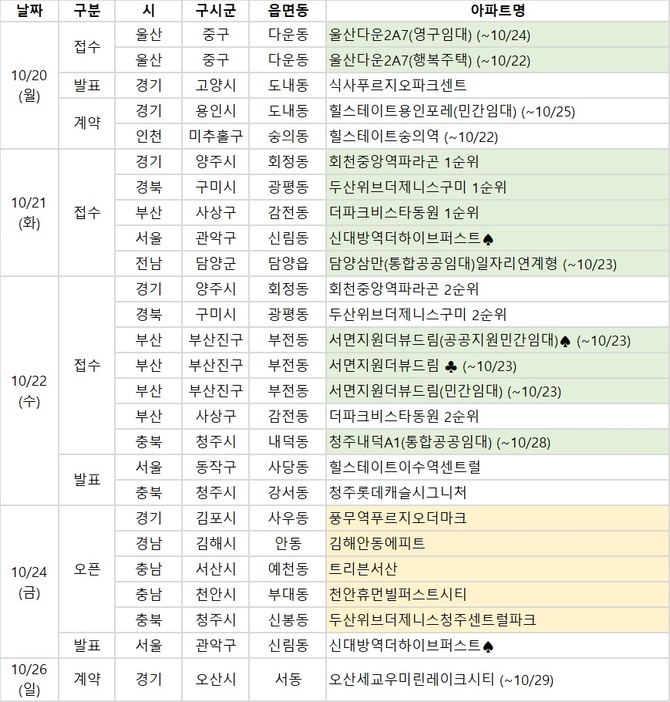 이외에도 부산 사상구 감전동 ‘더파크비스타동원’, 경북 구미시 광평동 ‘두산위브더제니스구미’ 등 지방 주요 도시에서도 청약 일정이 진행된다.