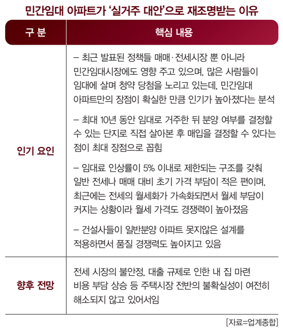 업계는 이러한 민간임대 아파트의 인기가 당분간 이어질 것으로 보고 있다. 전세 시장의 불안정, 대출 규제로 인한 내 집 마련 비용 부담 상승 등 주거 시장 전반의 불확실성이 여전히 해소되지 않고 있어서다.