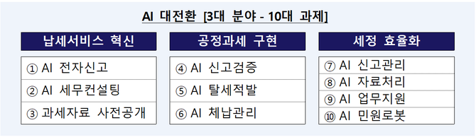 AI 대전환 3대 분야는 납세서비스‧공정과세‧세정역량으로 설정해 10개 세부과제를 추진한다.