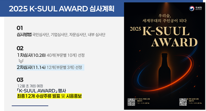 우리 술 해외진출을 지원하기 위해 중소기업을 대상으로 ‘K-SUUL AWARD’를 개최하고, APEC 등 국제행사에서 우리 술을 홍보한다.