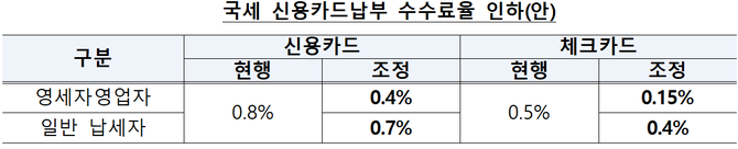 경영난을 겪는 납세자에게 납부연장 등 세정지원을 최대한 제공하고, 영세자영업자에 대해 국세 신용‧체크카드납부 수수료를 대폭 인하한다.
