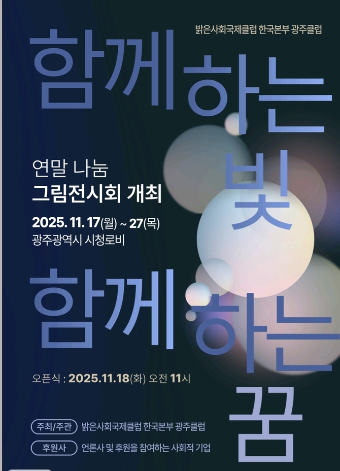 (조세금융신문=김영기 기자) 밝은사회국제클럽 한국본부 광주클럽(회장 정성균)은 이달 17일~27일까지 광주광역시 시청로비에서 연말나눔 그림전시회 ‘함께하는 빛 함께하는 꿈’으로 전시회를 개최한다.