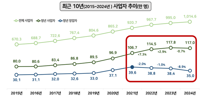 청년 신규 창업자 수는 2021년 39.6만명으로 정점을 찍은 후 점진적으로 줄어들며, 2024년 35.0만명을 기록했다.