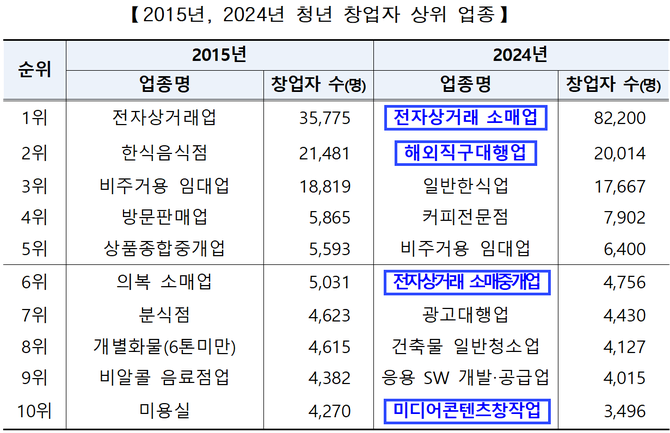 청년 창업 업종은 의류‧음식점 등 오프라인 점포에서 전자상거래업, 해외직구대행업 등 온라인 소매업으로 변화했다. 또한, 미디어콘텐츠창작업 등 온라인 기반 산업과 SNS마켓‧광고대행업 등도 높은 비중을 차지했다.