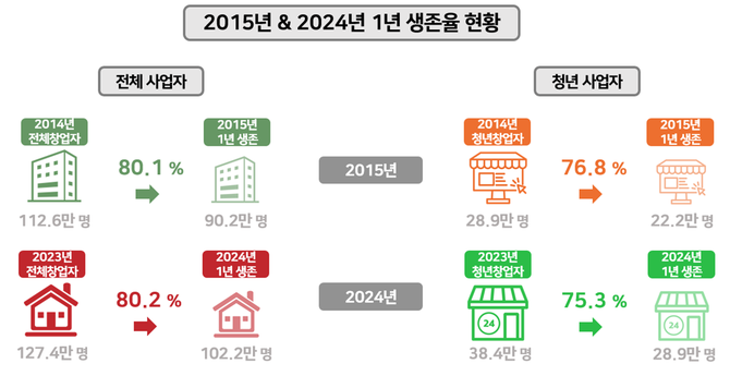 전체 창업자 대비 청년 창업자 평균 매출액 비율은 10년 전 79.9%에서 89.8%로 개선됐으나, 창업 후 1년 생존율은 10년 전 76.8%에서 75.3%로 소폭 낮아져 사업 주기별 지원이 필요하다는 것을 시사했다.