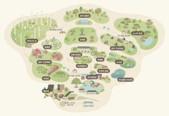 LG상록재단이 조성한 친환경 수목원으로, 17개 테마정원과 완만한 숲길이 이어진다. 약 4300여 종의 식물이 계절마다 풍경을 바꾸어 보여 주며, 특히 가을 단풍과 봄 신록이 아름다워 예약하기 어려울 정도로 인기가 높다. 나무 사이로 난 데크길을 따라 천천히 걷다 보면, 도심의 소음이 서서히 멀어지고 숲의 숨소리만 또렷이 들려온다.