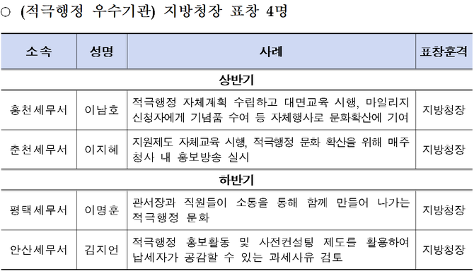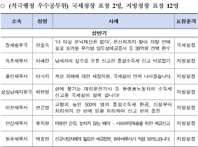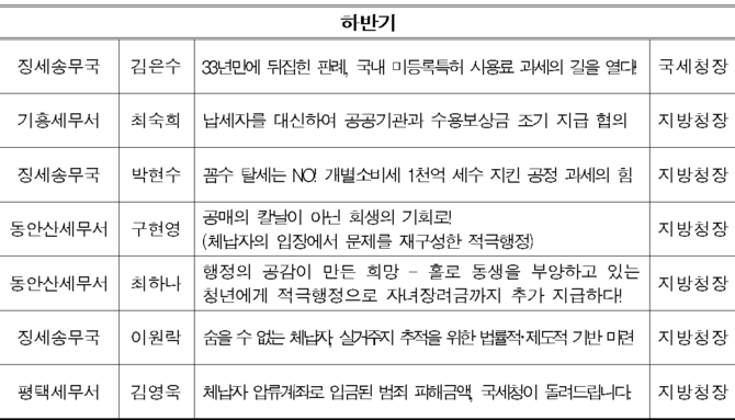 상반기 우수사례로는 체납자의 은신처를 찾아내고 차량에 은닉된 무기명 양도성예금증서를 확보한 중부국세청 징세송무국 한효숙 조사관이 선정됐다.