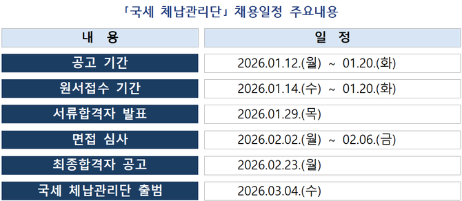 (조세금융신문=고승주 기자) 국세청(청장 임광현)이 전국에서 국세 체납관리단 기간제 근로자를 공개모집하고 오는 20일까지 원서접수를 받는다.