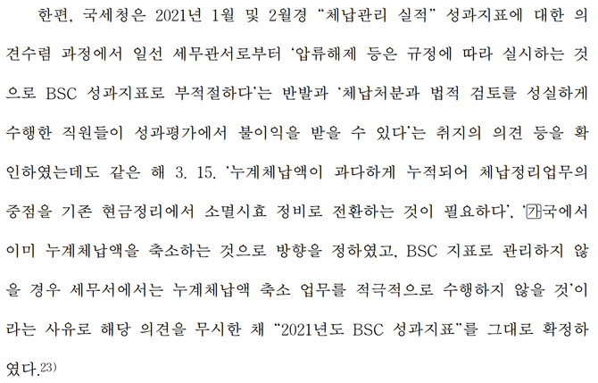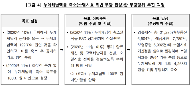 그렇게 해도 누적 체납액 목표 달성이 부족하자 아예 소멸시효 기산일을 직접 조작해 소멸시효가 지난 것처럼 꾸몄다는 것이 감사원 측 결론이다.