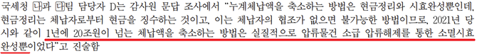 누적 체납액 공개시기인 2021년 6월까지 100조원 미만으로 숫자를 줄이려면 22조원이 넘는 막대한 체납세금을 정리해야 하는데, 2020년 한해 현금정리한 체납액이 10.6조원에 불과했다. 자연적으로 소멸시효가 완성돼 사라진 세금은 9.6조원 정도였다.