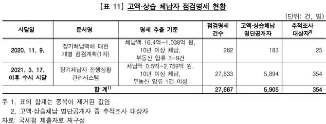 국세청 징세법무국 징세과는 여기에 덧붙여 2021년 3월 17일 체납액 5000만원부터 2759억원 고액체납자 2만7633명을 선정해 이들의 소멸시효를 점검할 것을 점검명세 형태로 시달하고, 이 과정에서 5894명이 불법적으로 압류해제 대상자에 포함됐다. 이중 354명은 추적조사 대상으로 선정된 자들이었다.