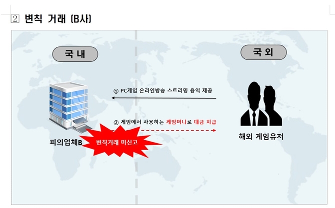 글로벌 PC게임 업체인 B사는 해외 유저들에게 홍보 용역을 의뢰한 뒤, 대가를 현금이 아닌 게임 내 재화인 ‘게임머니’로 지급했다. 이는 은행을 통하지 않은 지급 방식으로, 외환 당국에 신고하지 않은 변칙 거래에 해당한다.